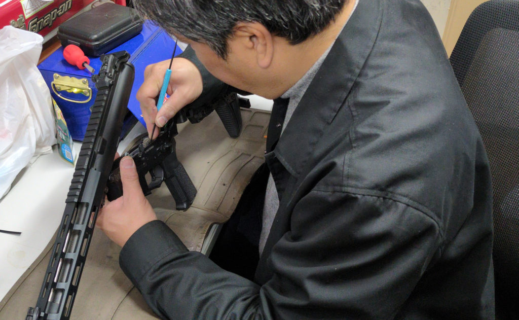 △エアソフトガンに対しては非常に真摯!後ろ姿でもわかるまなざしはまさにガンスミス。